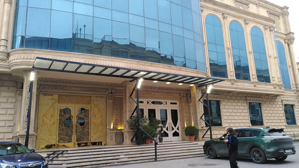 I passed the usual women workers on my way to the shuttle bus stop, sweeping the roads with their natural Azeri-style brooms; the old and the new, the grand and the modest observed side by side…