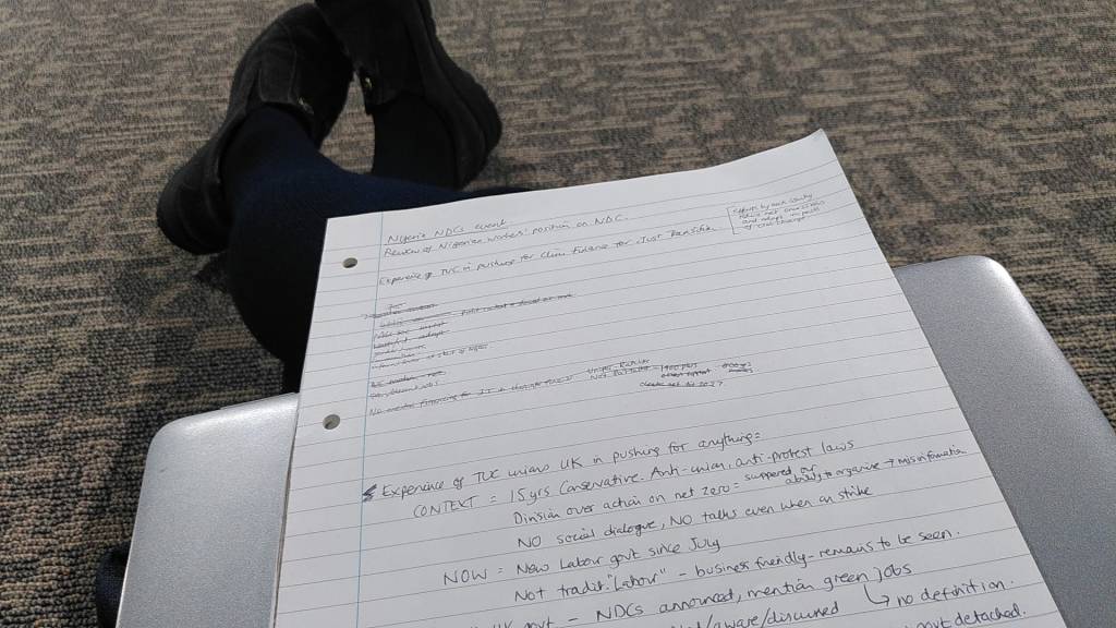 Lunch was taken on the floor by the bins (why are there never enough seats?!), frantically preparing the next meeting which was supporting the Nigerian Labour Congress in their campaign to be included in their own NDCs.