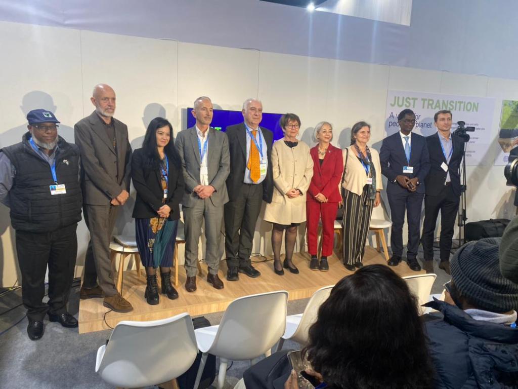 After taking time out to join the longest coffee queue ever and accidentally calling home whilst trying to juggle my coat, bag, coffee cup and bank card, I then attended the “official opening” of the Just Transition Pavilion. The three memorable messages here were the minister from the Biden/Harris government (who explained that they have put so much in place that there is much that will not be able to be undone), the indigenous speaker who urged us all to include nature in the just transition so that old mines and extraction sites can be restored for biodiversity and then our Nigerian brother Eche who had the last word stating “none of the transition can happen without the workers”!