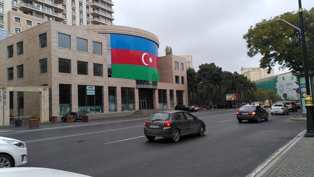 You can see the country’s flag above. Baku is a very old city but also has lots of very modern buildings.