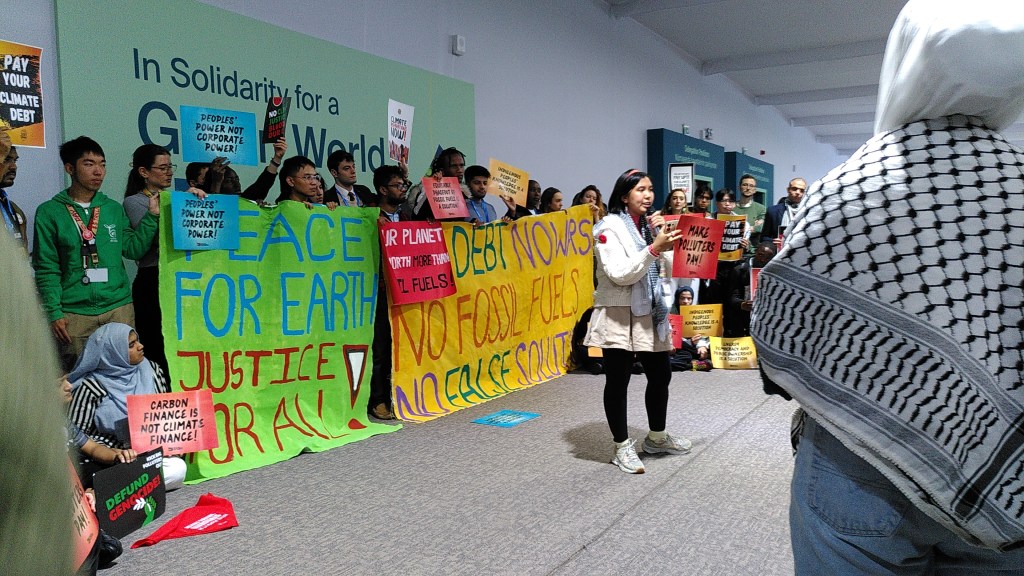 These young people had a protest at COP to ask the richer countries like ours to pay more money to help their countries to cope with climate change and to spend money on things like wind turbines and solar panels so that we stop using fossil fuels.