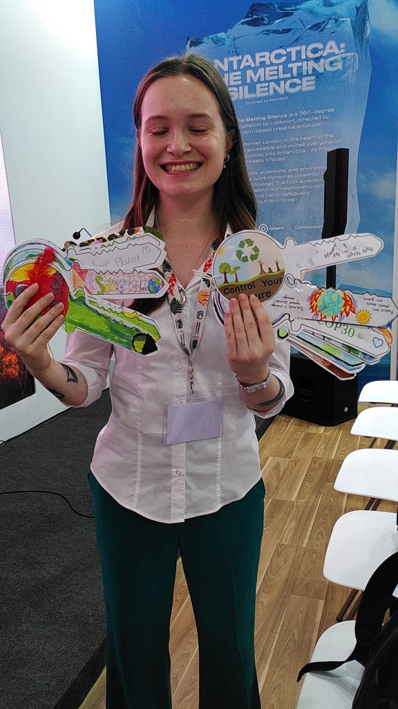 From here, our merry band of lobbyists went on to the UK Pavilion for a meeting on “Education Resilience and Funding” which disappointingly had no educator on the panel, but we restored the balance as we added in comments and questions on listening to teachers, addressing child poverty and also I waved around the climate keys which I brought with me from Brent schoolchildren- to try to help unlock their futures!